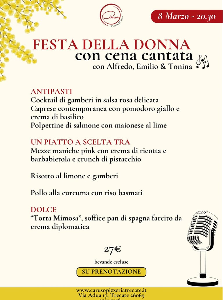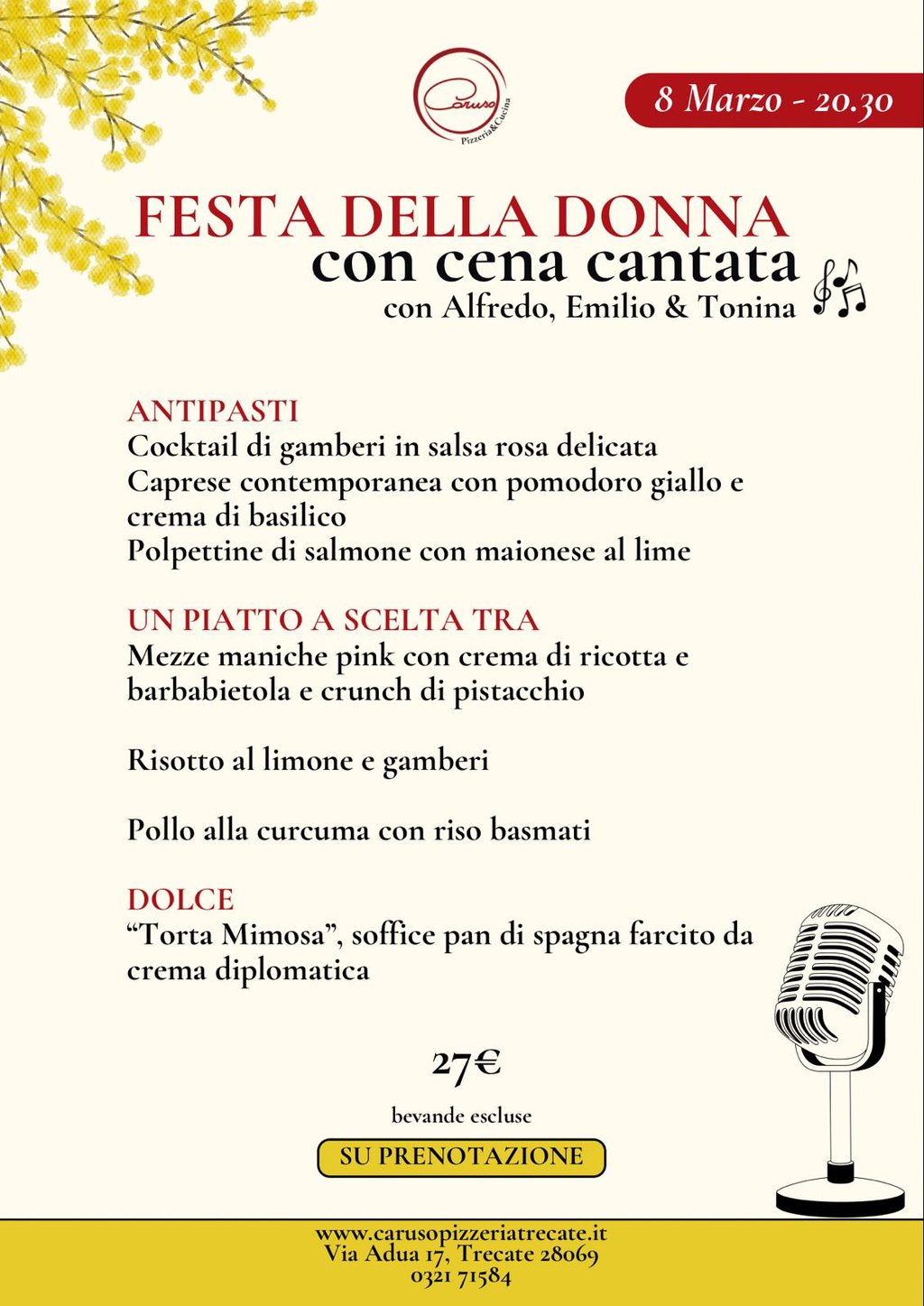 L’8 marzo celebriamo insieme la Festa della Donna con una cena cantata che unisce buona cucina e divertimento. Una serata pensata per stare bene, ridere, cantare e condividere un momento di leggerezza in compagnia di Alfredo, Emilio & Tonina, che animeranno l’evento con musica e intrattenimento dal vivo.