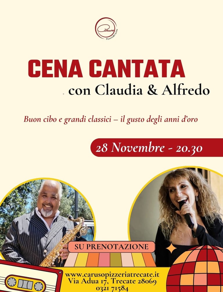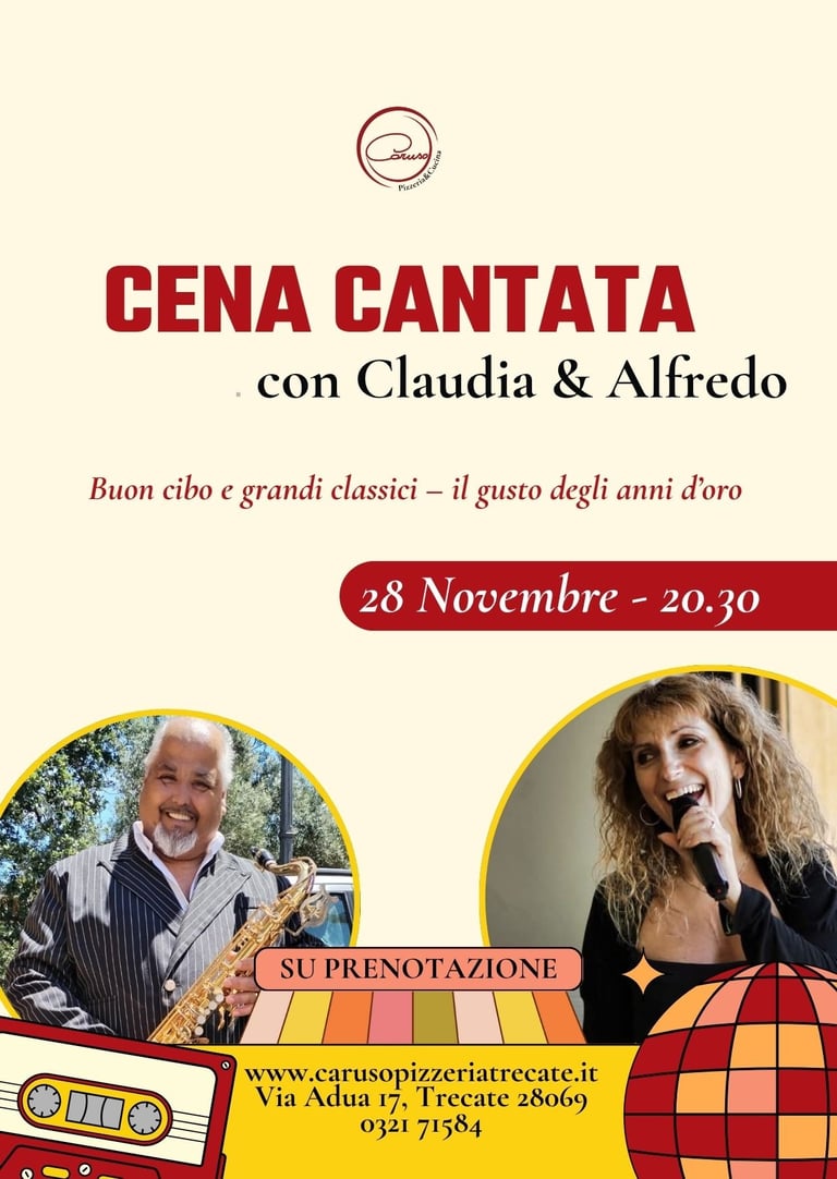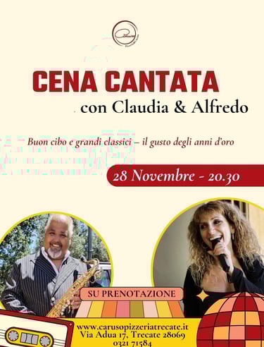 Preparatevi a un tuffo nei favolosi anni d’oro con Claudia & Alfredo, protagonisti di una serata dove la musica incontra il gusto! Dagli evergreen dei ’70, ’80 e ’90, fino ai brani che hanno fatto la storia, ogni canzone sarà un viaggio tra ricordi e emozioni — accompagnato da un menù speciale pensato per rendere ogni nota ancora più irresistibile.