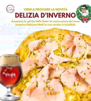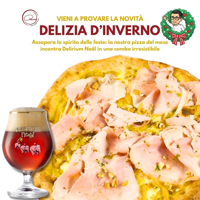 A completare l’esperienza, l’abbinamento con la Delirium Noël: una birra ricca, speziata, con note di malto dolce e frutta candita che esaltano ogni morso e amplificano il calore della pizza.